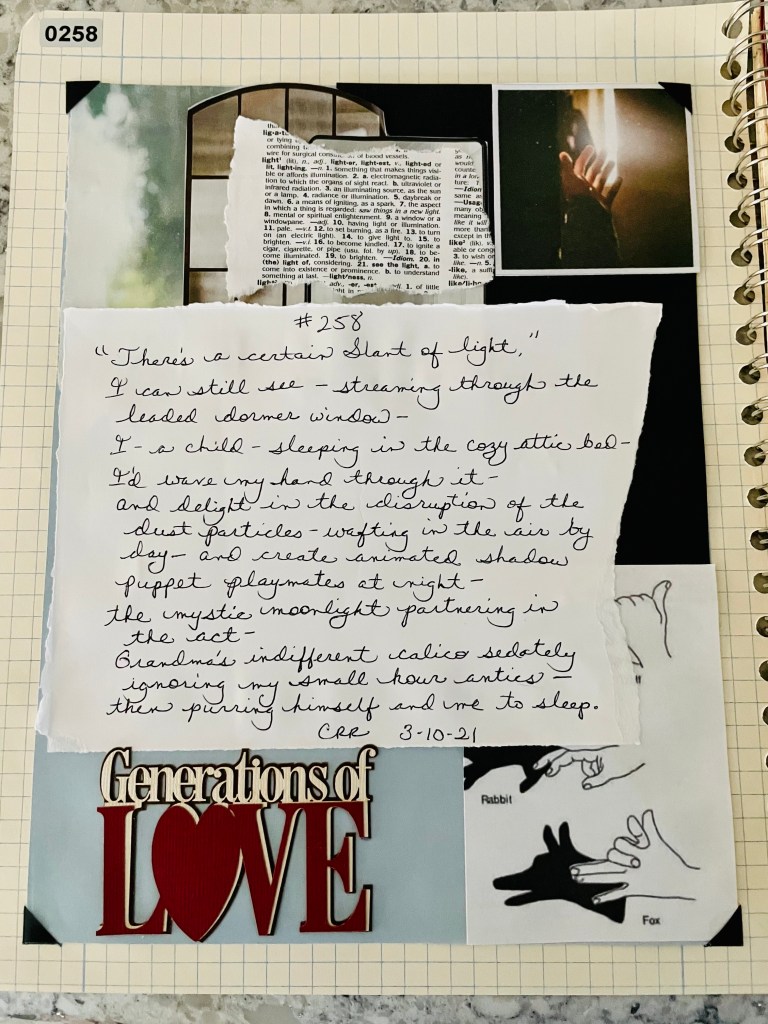 Light carries so much symbolism, with our greatest source of it, the Sun, being one of the two things that all of life on our planet depends on. It illuminates and nourishes and without it, from plants to humans, life would quickly die off. In Emily’s poem, she used multiple literary devices and has the unknown speaker addressing the themes of despair, religion, nature, truth and transformation, all emanating from a certain slant of light streaming in or through. My poem is definitely less ambiguous and uncomplicated. It’s a nostalgic poem that I wrote by traveling in my mind back more than half a century. Well, that makes me sound ancient, doesn’t it! LOL