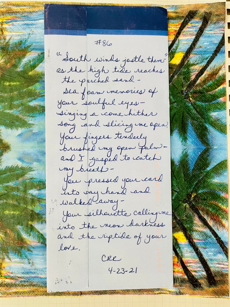 Certain places hold sensory and muscle memories, and bring special moments back to mind. The shore and ocean do that for me. As the tides move in and out twice each day, they bring forth and take away, reminding us that life does the same. Today, the first line of Emily’s poem #86 and the South winds blew the briny air and sent seafoam and memories of a past love, dancing across the sand and through my mind.