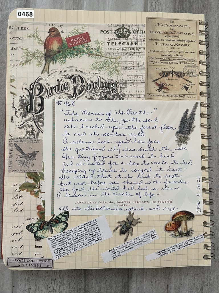 When she ventured outside her Amherst home, Emily explored as an avid naturalist, and spent much time surveying, cataloguing and appreciating the wide variety of life forms. As a mother of two young children, I sought to get them outside as much as possible and to let them learn from and experience all the wonders of the natural world. On one particular trek through the woods in back of our North Carolina mountain home, my 4 year old daughter came upon a tiny fallen bird, unmoving and sadly dead. This poem is about how she reacted.