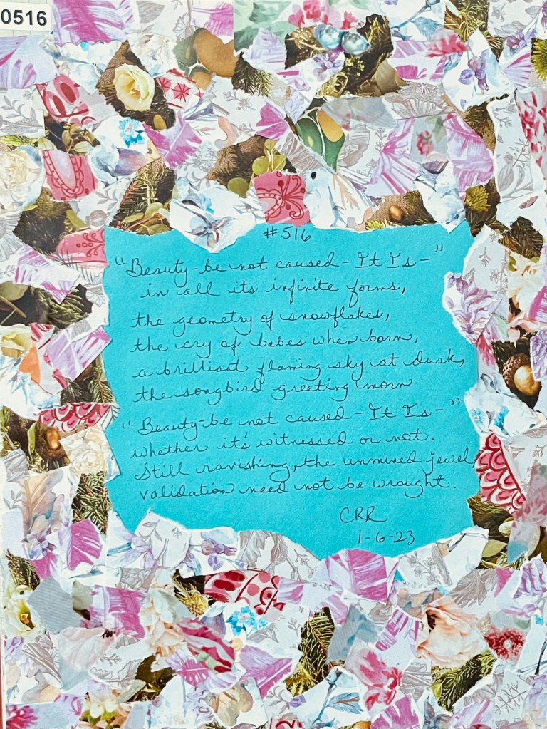 I ardently agree with Emily that beauty simply IS, its cause unidentifiable. Of course the beauty we are both referring to (and I’m assuming, since I can’t ask her) is the natural untouched beauty of the earth and all things natural in it. But it might also be the beauty we each see through our own particular lenses that could be referenced here. The judgement of beauty is said to be “in the eye of the beholder”* therefore existing in our individual minds, and I don’t disagree.