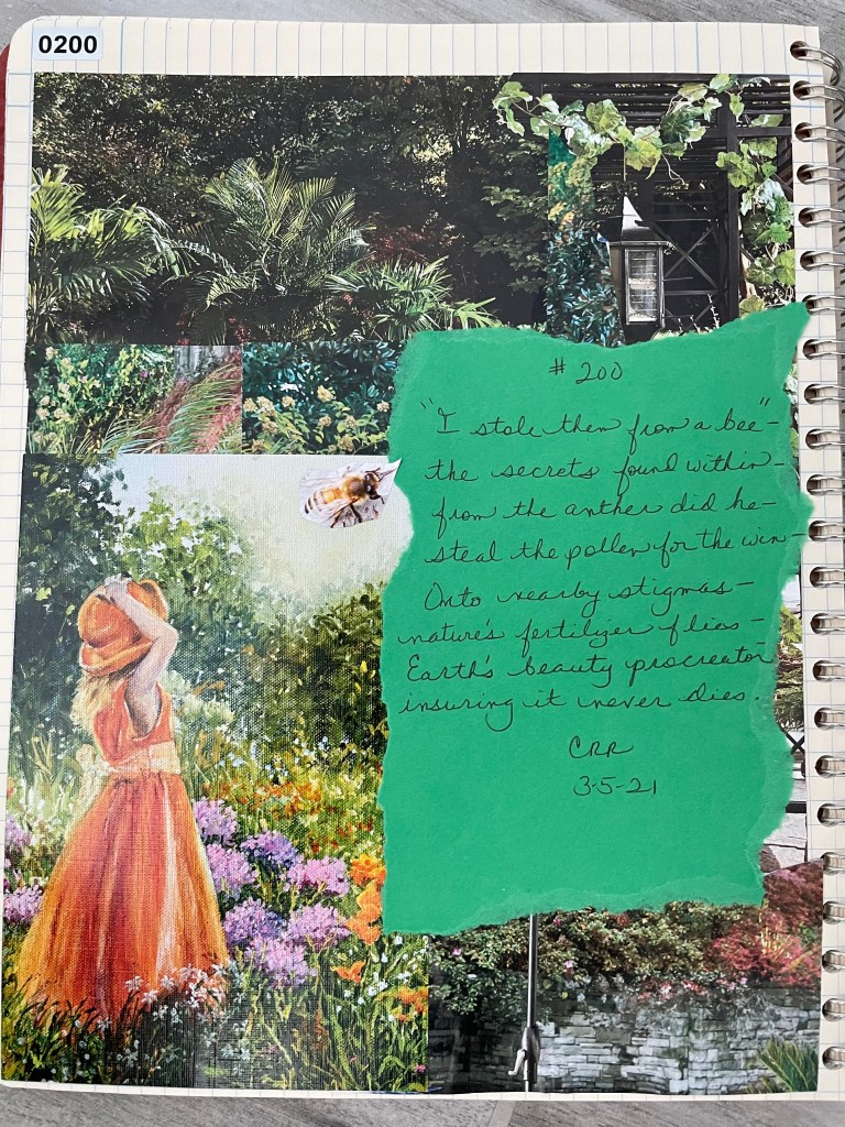 The quote “Write drunk, edit sober” has been misattributed to Ernest Hemingway but according to Quote Investigator, there seems to be no evidence that he ever said that. Hemingway was known to drink often, but he wrote in the mornings and did not drink until the afternoon. Speaking of drinking, for today’s Carol and Emily poem, I had to look up the word “quaffing”. The Oxford Dictionary tell us that it means “drink (something, especially an alcoholic drink) heartily.” Not unlike Hemingway, I have been known to drink heartily from time to time, but definitely not when writing. It doesn’t work for the bee, who can’t find her way back to her nest or is rejected by the other bees if she does, and it doesn’t bode well for me if I want to make any sense.